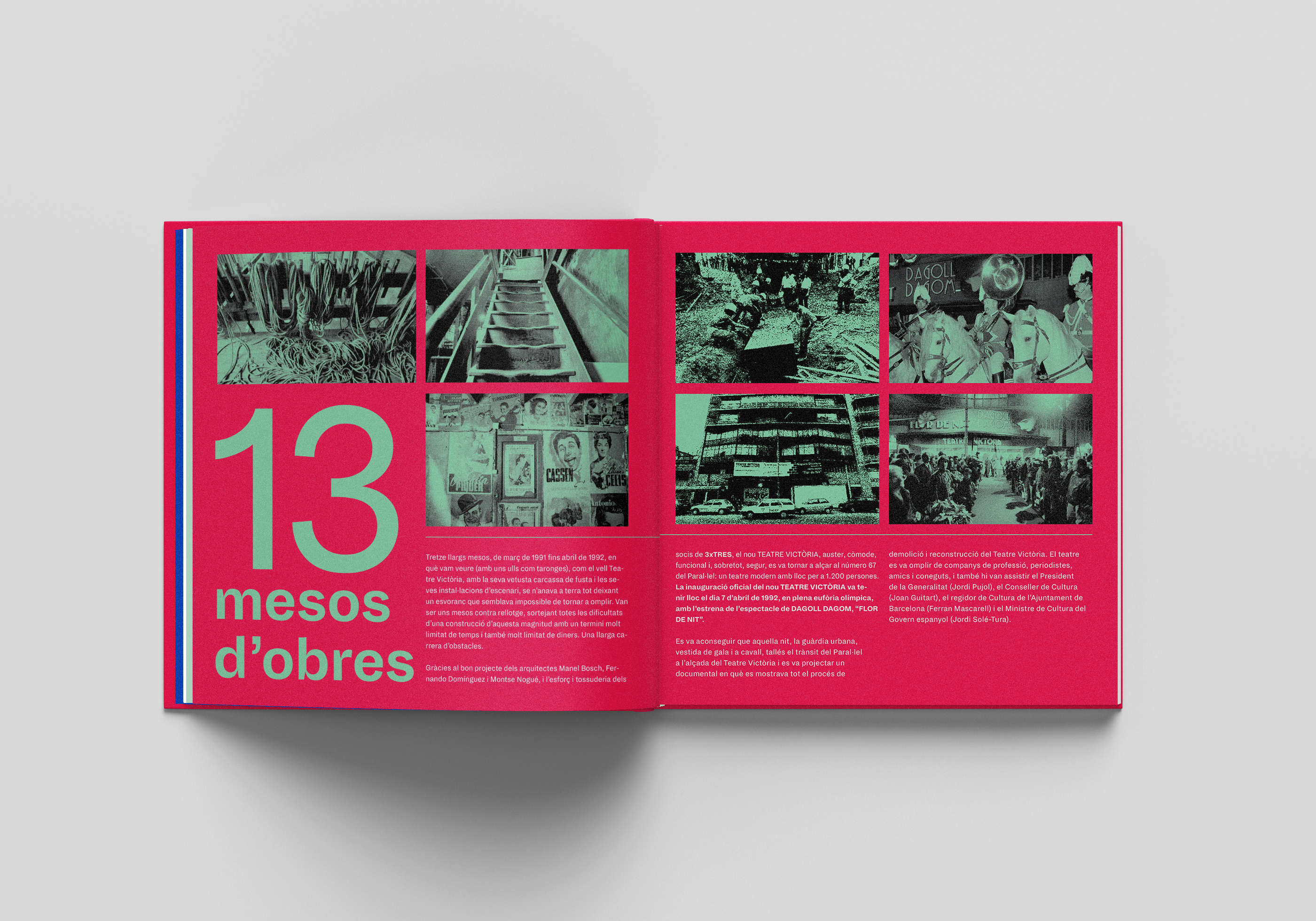 Graphic and layout design of the commemorative book of the 33rd anniversary of the theatre company 3xTRES ownership of Teatre Victòria, one of Barcelona's most famous venues.